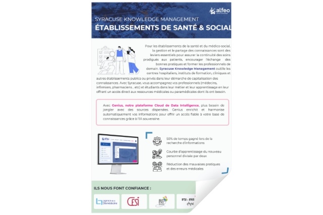 Spécialiste de la gestion de l'information depuis plus de 30 ans, éditeur de la plateforme Syracuse Knowledge Management et des services d'IA souveraine Genius. Alfeo met à votre service son expertise technologique et opérationnelle pour garantir la bonne diffusion de vos connaissances et informations auprès de vos professionnels. Avec Syracuse Knowledge Management, vous centralisez vos ressources dans un référentiel unique connecté à des bases, thésaurus et standards communs : une véritable "source of knowledge" vivante, accessible et engageante. Avec Genius, notre plateforme Cloud de Data Intelligence, plus besoin de jongler avec des sources dispersées. Genius enrichit et harmonise automatiquement vos informations pour offrir un accès fiable et directement exploitable à votre base de connaissances